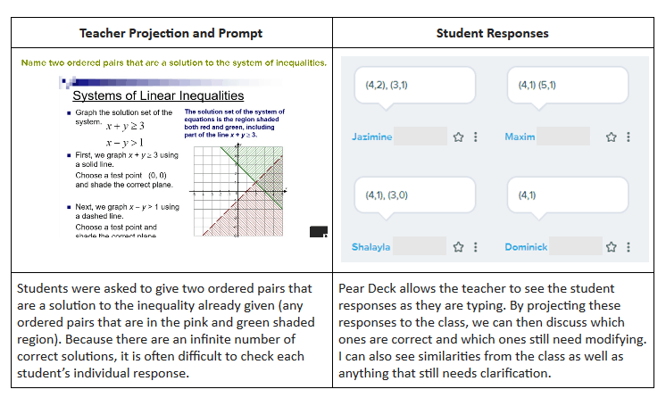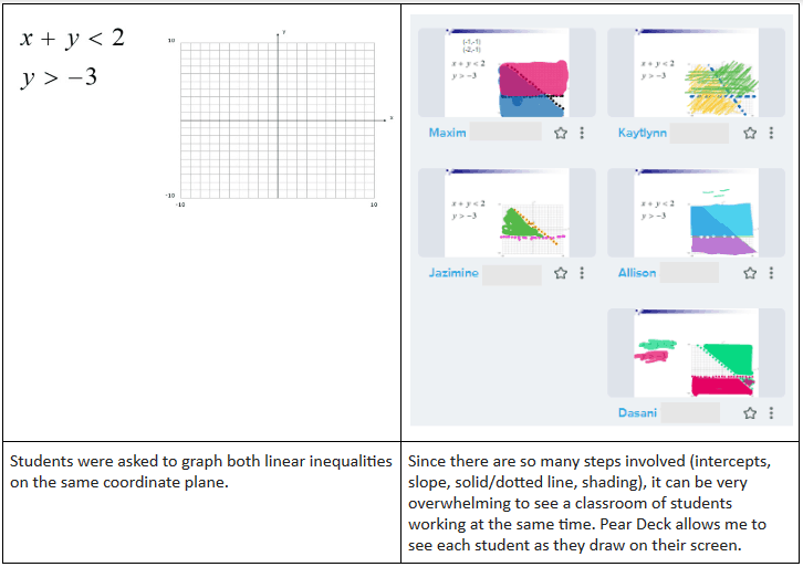 I chose to try Pear Deck for the first time in my Math 1 classroom while teaching students to graph systems of linear inequalities. With this topic, there are so many steps involved in getting these accurate that it is very difficult for me to check all of the students’ progress as they are working. By allowing me to see what the students are writing or typing on their screens, Pear Deck allows me to provide instant feedback and correct mistakes while they are happening–something I couldn’t do trying to look over shoulders! It also helps facilitate my class discussions by allowing our class to discuss different student responses. This is a great way to make sure all students get to participate in the discussion, not only the ones who are always eager to share.