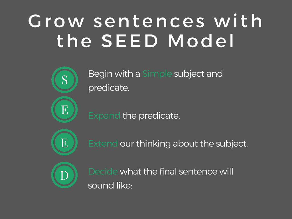 - Grow Sentences – Use a technique I like to call SEED to help students see how simple sentences can grow, just like a seed when we plant it and feed it. Ask questions to gather information that will be used to expand the predicate. Then, lead students to say something else about the subject that will extend our thinking about it – adjectives? Add an appositive? Once all of this is gathered, work to order the resulting phrases, perhaps add a conjunction, decide what the final sentence will sound like.