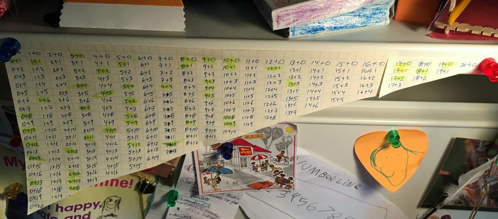(The addition map is like the one I showed in this post.) We use magnets to pin the maps to metal shelves above the kids’ desks. Each weekend, they chart new progress using a highlighter.The maps are a great way to recognize accomplishment. The kids love adding to the maps and seeing their maps fill up over time. Completing the map brings a strong sense of satisfaction and achievement.For my purposes, the map also suggests hypotheses about where prerequisite concepts might be lacking. I can address those directly in a separate line of work.Here’s what our flashcards look like. They are made out of ordinary 3×5 note cards. (To save paper, I write several problems on each note card and then cut them out with scissors.)