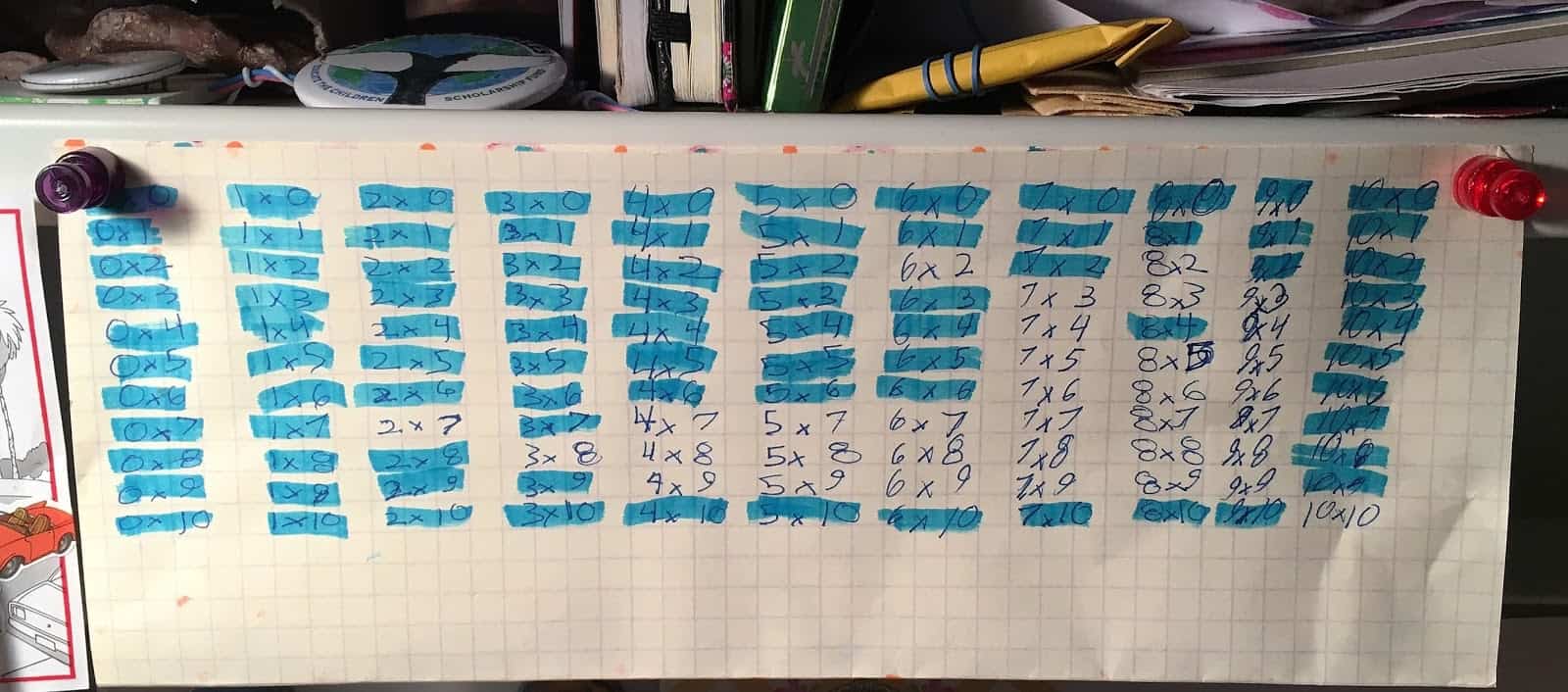 This work proceeds in tandem with our other activities, including worksheet practice on facts (customized according to what the map says). Eventually, the day comes when there are no more cards left in the bank and the entire map has been highlighted. Time to celebrate! From then on we’ll still do occasional maintenance practice to keep the facts secure (worksheets or a configurable app), and of course there are the worksheets that come home from school.