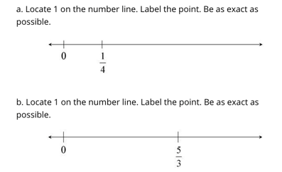 Unlike the shaded rectangle, this example requires students to have a strong understanding of partitioning and the meaning of the denominator; it requires students to understand that 4/4 and 3/3 are equal to 1, and it requires students to use that knowledge to locate the number 1 on each number line using the given referents.