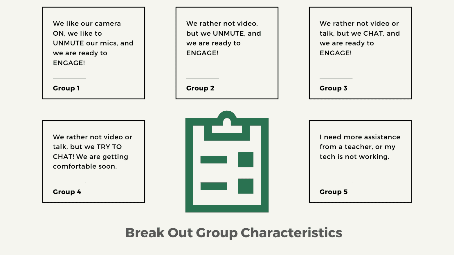 The following sessions continued smoothly. For the next few days, we kept the same group characteristics and noticed how students moved into different groups by the day. Some noted that background noise prohibited their mic one day, and others developed greater confidence to turn on their cameras. Offering students choice and voice, with daily variation, was a success!