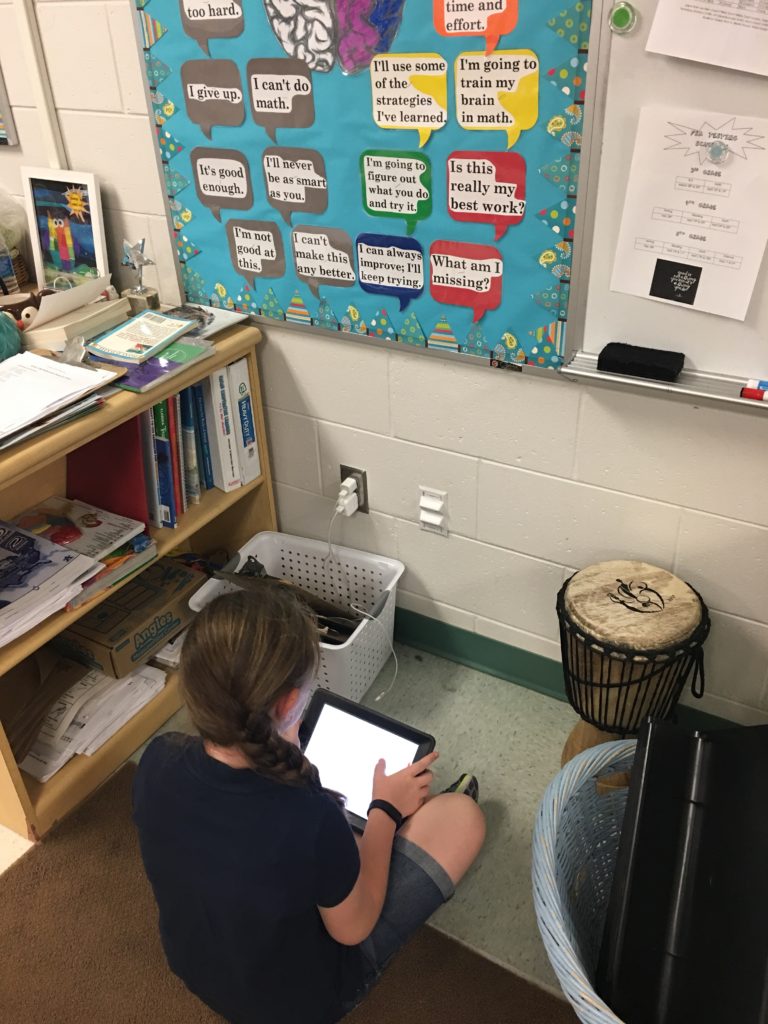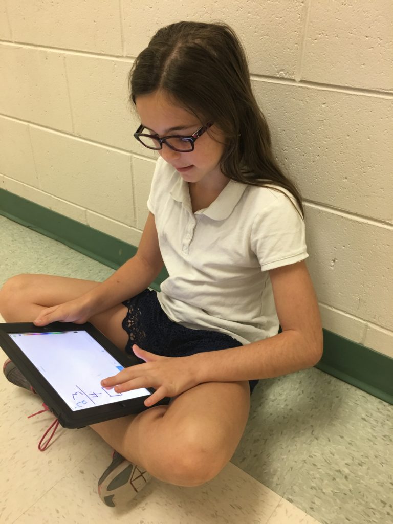 In addition, listening closely to student language allows the teacher to examine his/her teaching of the concept. Did the student take on the language appropriate to the concept that was taught? Analysis of student language can highlight imprecise math language used by the teacher. Technology like Seesaw offers an excellent way to facilitate this process. Seesaw, which offers both free and paid versions of its product, is a digital portfolio for the classroom that allows students to document their learning, encouraging deeper understanding and reflection. Students are able to create a video recording of themselves solving a math problem on a whiteboard. They can use the Draw feature to illustrate the mathematical problem and the Record feature to capture their explanation of each step of their solution process. I tried this out while teaching fractions as a fourth grade teacher. Students took turns recording themselves in various “quiet zones” such as the hallway, corners of the room facing the wall, and even the bathroom, using eight iPads.