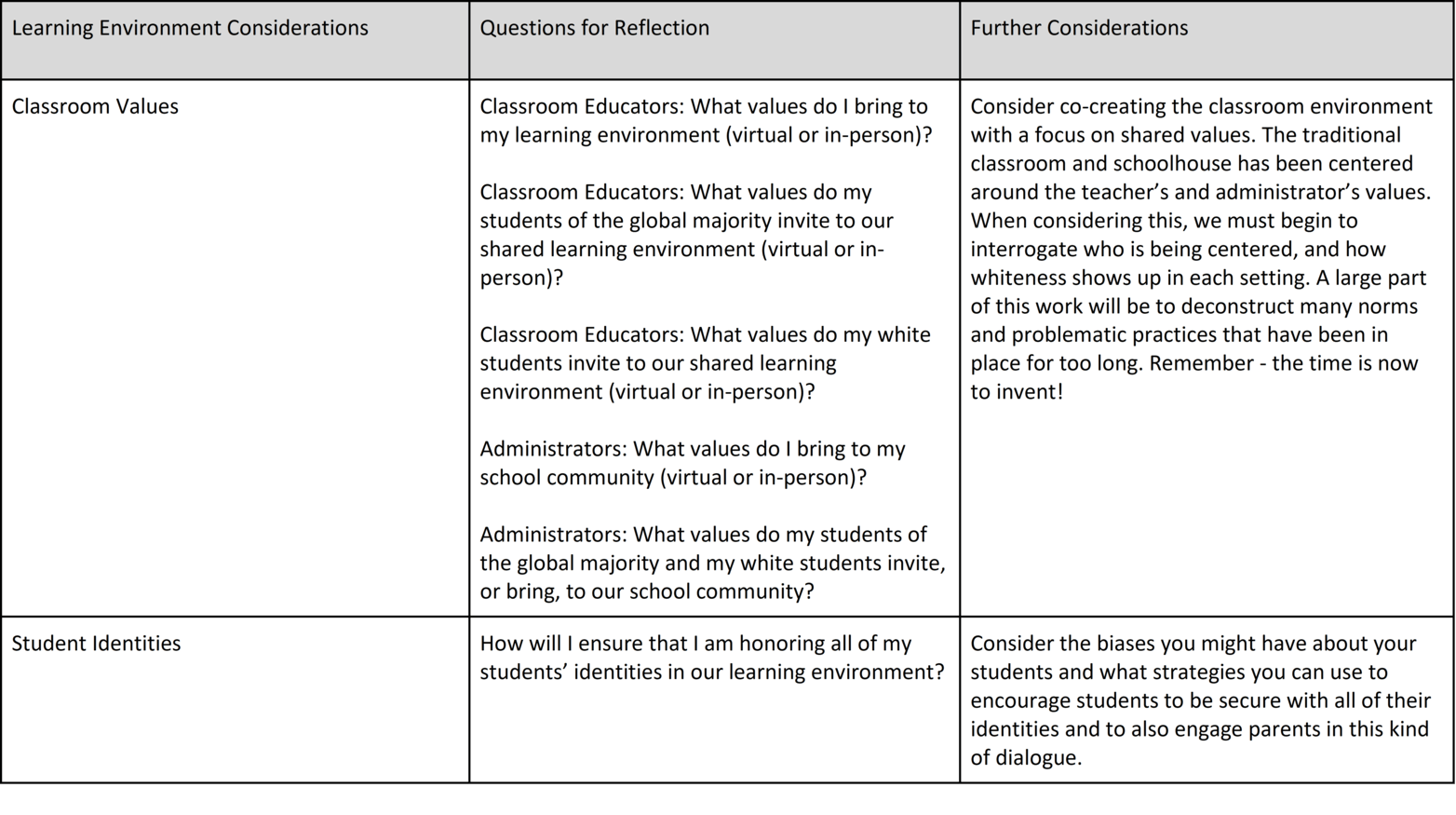 The table below considers a variety of learning environments and the questions you might use to reflect on whether those environments are equitable. While the table is not exhaustive, it can be a great starting point when thinking about how to repurpose our educational experiences for students. When planning and preparing for instruction, whether virtual or in person, consider the following to redefine your best practices. If you find that you are having difficulty with reflecting on the items and/or responding, I invite you to ask yourself why and engage in being open to thinking differently.