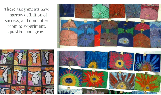 Search Pinterest for ‘art lesson,’ and you’ll find many beautiful examples like the ones below. When I taught art at the elementary school, these were the type of projects expected. They provided an easy check-off of objectives and the results were simply assessed. And, frankly, they are pleasing to look at. However, with projects such as these, kids are demonstrating little more than that they can follow directions. It is setting them up to define success in whether or not their picture looks ‘right’ or ‘wrong,’ and offers little opportunity to experiment, question, and grow.