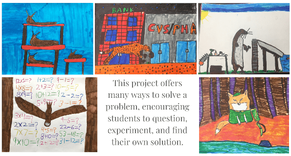 All the artworks in the example below are from the same project; students learned about anthropomorphic animals, looking at examples of them through art, literature, and pop culture. They chose an animal, drew it realistically from photographs, and then used the background to show what human traits the animal has come to represent. You can see the radically different ways kids approached the assignment, exploring the concept through their own interests. 5th grade teacher Ms. Howland Bolton said, “The concept of Anthropomorphic Animals is usually a little complex for 5th graders to grasp but they totally got it during this lesson.” By designing our projects with a Growth Mindset in mind, we allow multiple paths for students to engage with the concept. When connected with the learning students are doing in their classroom, it becomes a powerful tool to build knowledge and engagement around core content.