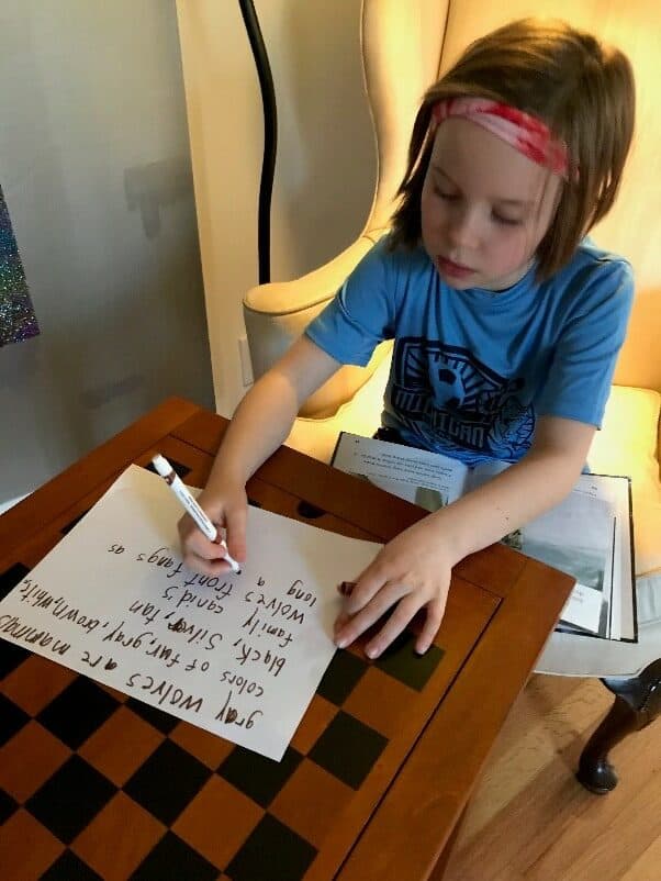 I’d love to claim this moment as a reflection of my successful parenting, but I’ll be honest here and say that my daughter’s typical depiction of a day of learning is, with painful prompting, typically limited to something along the lines of “we had art today.” But on this day, there was real news: the “cool” something she was referencing was an actual research project on an animal of their choosing. (She chose wolves.)