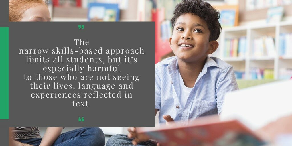 However, we know that the knowledge found in texts does not always match the rich funds of knowledge all students bring with them to the classroom—and this is often especially true for students of color and/or English Learners. The narrow skills-based approach limits all students, but it’s especially harmful to those who are not seeing their lives, language, and experiences reflected in text.