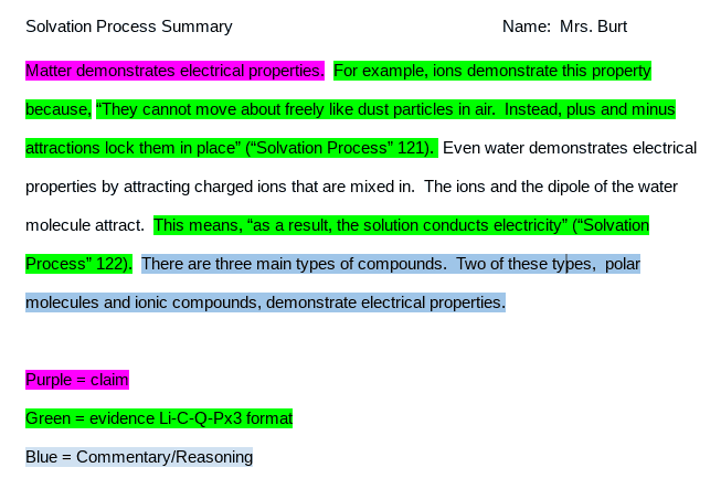 The amount of evidence and commentary will vary depending on whether they are writing an argument paper in English or a summary of a science text, and often a second quotation, commentary, and a concluding statement will be included. We knew our efforts were working when other teachers started asking us what this “Li-C-Q-Px3” was all about and when students started complaining that “ALL” of their teachers were asking them to do this now.
