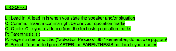 One of the common strategies we agreed on for citing quotations as evidence is called Li-C-Q-Px3. Not only did this emphasize for students the fact that they needed to use direct quotations for textual evidence, but it also provided a specific structure that supported some of our reluctant writers. With this strategy, a student first identifies or makes a claim, and uses this format to embed their supporting evidence.
