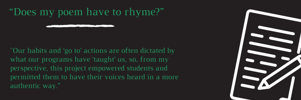 A common question from students was, “Does my poem have to rhyme?” This question (and our ability to free students from the stereotypical poetic structure through our response) illustrated the power of allowing students to explore their creative intellect. Our habits and ‘go to’ actions are often dictated by what our programs have ‘taught’ us, so, from my perspective, this project empowered students and permitted them to have their voices heard in a more authentic way. The focus wasn’t on following rules or mirroring models, but on conveying unique ideas.