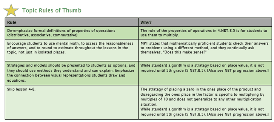 Following the Anchor Tasks, you’ll find the Topic Rules of Thumb, which give specific guidance for what to emphasize within the topic. Often, they elaborate on how the two Pro Tips apply to the specifics of that topic. Each Rule of Thumb has a rationale that is based on college- and career-ready standards and/or the Progression Documents. For some topics, the Topic Rules of Thumb also work to strengthen coherence by reordering lessons and providing guidance on making connections between concepts explicit for students.