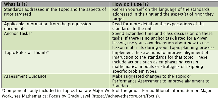 The first two components in the table above provide background knowledge about the standards at play in the topic. The Anchor Tasks are intended to guide teachers in how to spend instructional time within a unit. They are the highest-leverage, best-aligned tasks to build student mastery and knowledge of the topic. Most Anchor Tasks are straight from enVisionmath 2.0, but some are links to high-quality open education resources. The Anchor Tasks are not meant to comprise everything that happens in the classroom in a given topic; they are designed to support decision-making for what is worth spending instructional time and class discussion on, and what additional aspects of the lesson or topic to use or skip as teachers are planning.