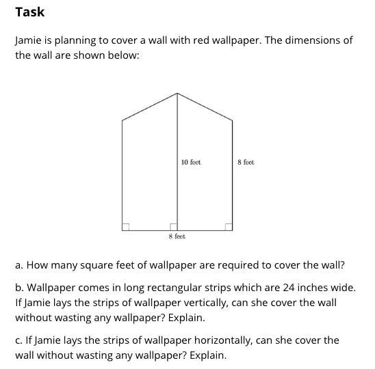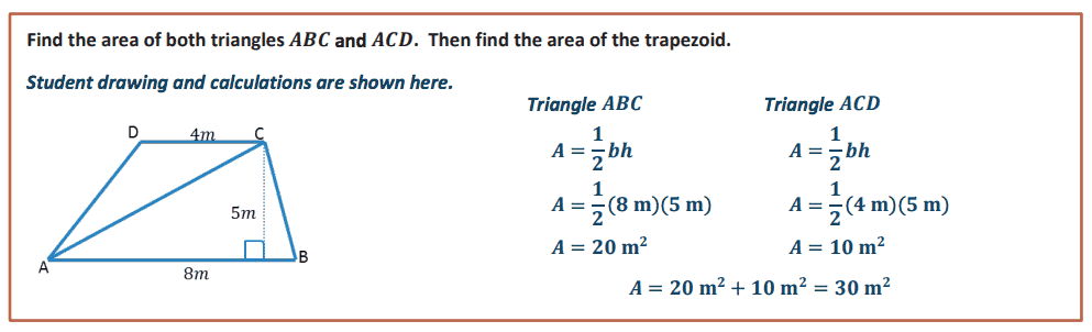 The next standard of interest is 6.G.A.1. The intent of this standard is to have students composing and decomposing figures in order to find the area of composite figures. These Illustrative Mathematics and EngageNY tasks are examples of the type of tasks that students should be engaging in to meet the intent of this standard. Both problems expect students to decompose the given figure into rectangles and/or triangles in order to find the area of the shape. There is no need to require students memorize the area of a trapezoid! They should decompose it into shapes for which they know how to find the area!
